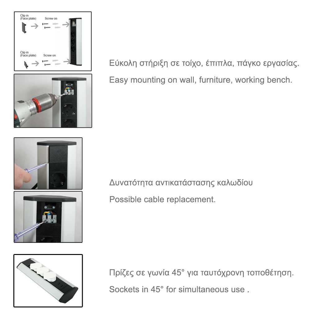 Διαθέτει 3 πρίζες τύπου σούκο υπό γωνία 45° για ταυτόχρονη τοποθέτηση πολλών συσκευών.